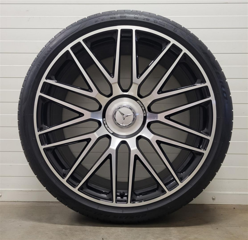 Original Mercedes S-Class (W223) AMG wheel set with lightly used summer tyres Pirelli P Zero PZ4 (MO-S, PNCS) 2 pcs 255/35 R21 98Y XL and 2 pcs 285/30 R21 100Y XL and tyre pressure sensors.